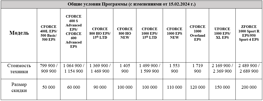 В связи с выходом новинок техники CFMOTO 2024 модельного года (CFORCE 800 HO и 1000 EPS NEW, ZFORCE 950 Sport-4 EPS, UFORCE 1000 XL EPS) сообщаем, что они также включены в нашу Программу «TRADE-IN от CFMOTO». Напоминаем всем любителям квадродвижения, кто задумался о смене своего квадроцикла на новый CFMOTO, что сейчас это можно сделать с еще большей выгодой. Программа распространяется на приобретение новых квадроциклов ATV или мотовездеходов Side—by—Side CFMOTO теперь со скидкой от 50 000 до 200 000 руб.!