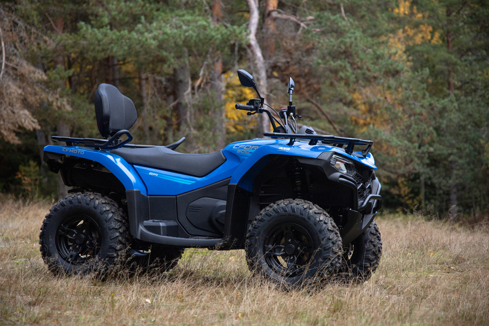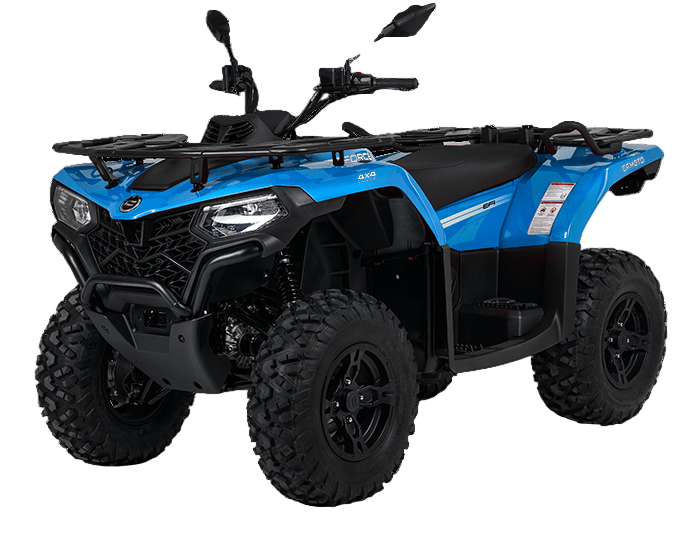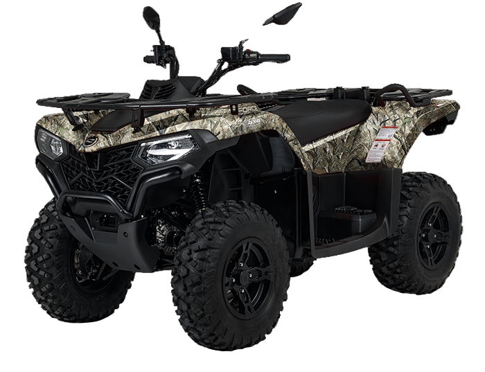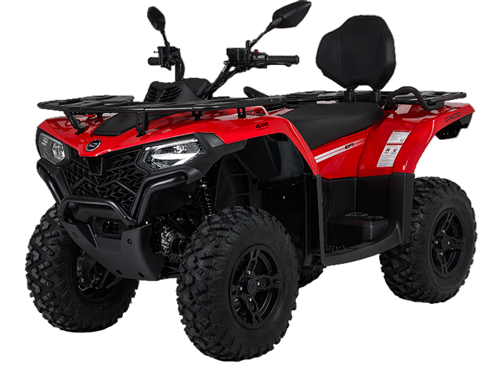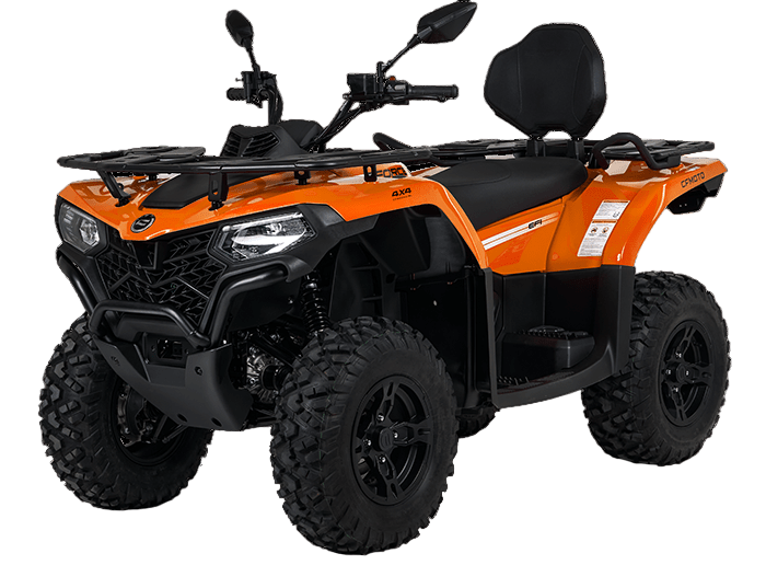 Вариатор CVTECH (Канада), стальные рычаги подвески, улучшенные амортизаторы с прогрессивной пружиной, комбинированная оптика, LCD-панель приборов, зеркала заднего вида, двухместное сиденье со спинкой и ручками для пассажира, багажные площадки из стальных трубчатых элементов с повышенной грузоподъемностью, передний стальной бампер, 12″ алюминиевые колесные диски, 25″ резина с универсальным рисунком протектора, аккумулятор повышенной емкости (30 Ач), электрическая розетка 12 V, розетка USB, задний «бардачок» объемом 10,5 л, съемный фаркоп (без шара)